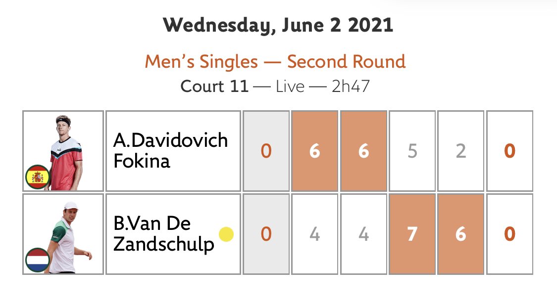 Just click on the category name in the left menu and select your tournament. Live score updated point-by-point. Botic Van De Zandschulp scores service is real-time updating live.
